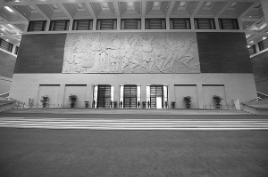 1940年,在中國(guó)人民抗日戰(zhàn)爭(zhēng)的艱難時(shí)刻,藝術(shù)大師徐悲鴻先生創(chuàng)作了一幅震撼人心的《愚公移山》油畫(huà)。如今,這幅中國(guó)油畫(huà)史上最精彩的作品之一,被做成一幅寬36米、高12米的巨大浮雕,在國(guó)博西大廳正面墻上迎接著每一位參觀者。浮雕對(duì)面,是7扇十多米高的銅門,透過(guò)門上的青銅鏤空?qǐng)D案,可以看見(jiàn)人民大會(huì)堂和天安門廣場(chǎng)。