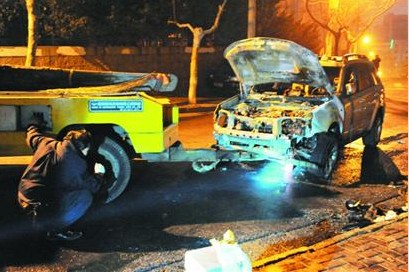 “在上清路與尖山路路口,一輛停在路邊的越野車突然起火了,火勢很大。”昨天晚上9點35分左右,市民朱先生撥打早報熱線82888000報料。記者聞訊趕到現(xiàn)場時,消防人員已經將火撲滅,記者看到,著火的是一輛越野車,整個車身已經被燒成了空殼,車內一片狼藉,而停在越野車前面的一輛別克轎車,車尾被高溫烤壞,烤化了的保險杠都掉在地上?!斑@是我?guī)讉€月前剛買的新車,平時我開車的時候都是小心翼翼,沒想到如今成了這副模樣,叫我怎么能不心疼。”車主告訴記者,他花了30多萬買下這輛斯巴魯越野車,新車還沒開過癮就被燒成了“廢柴”,他每晚都把車停在這個地方,沒發(fā)現(xiàn)過什么問題。