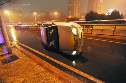 “在山東路上,一輛轎車在駛上澳柯瑪立交橋的時候突然撞上了隔離墩,發(fā)生側(cè)翻。”前天晚上8點10分左右,市民李先生撥打早報熱線82888000說。接到報料后,記者立刻趕到事發(fā)現(xiàn)場,在澳柯瑪立交橋上橋口記者看到,一輛銀灰色的起亞轎車右側(cè)向下,側(cè)翻在上橋口處,車頭凹陷,地上散落著一些汽車零件碎片?!爱?dāng)時這輛車沿著山東路往橋上拐,也許是司機不熟悉路或視線受阻,我眼睜睜地看著他沖向上橋口處的隔離墩?!蹦繐粽呃钕壬嬖V記者,由于那個隔離墩有個坡度,所以轎車竟然騎上了隔離墩,在上面滑行了十多米后側(cè)翻在馬路上?!拔覝?zhǔn)備拐彎上橋,去團島辦事,當(dāng)時雨下得挺大,視線很模糊,我拐彎的時候并沒有看到前面的隔離墩,開到眼前的時候才看到。”提起剛才的一幕,轎車司機王先生仍然心有余悸,他告訴記者,所幸車速不快,帶坡度的隔離墩起到了一定的緩沖作用,不然后果不堪設(shè)想。(見習(xí)記者 徐棟 攝影報道)