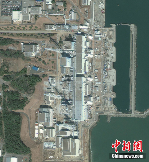 3月18日(當(dāng)?shù)貢r間上午10時03分)拍攝的衛(wèi)星照片顯示的是日本福島第一核電站。