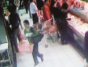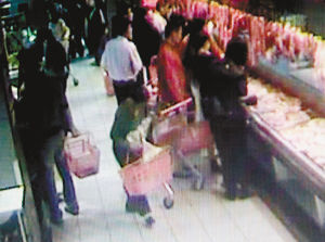 昨日下午,重慶晚報(bào)記者來(lái)到該超市,通過超市監(jiān)控錄像,看到了搶奪全過程:一名年逾五旬的盤發(fā)髻的婦女,手提購(gòu)物籃,身穿深綠色V領(lǐng)針織衫,配一條黑色長(zhǎng)褲,胸前還有東西閃著銀光。