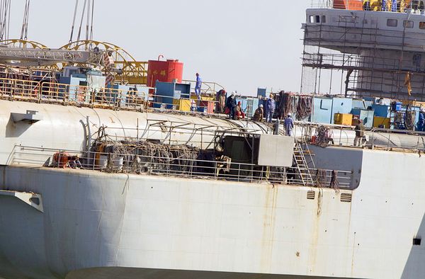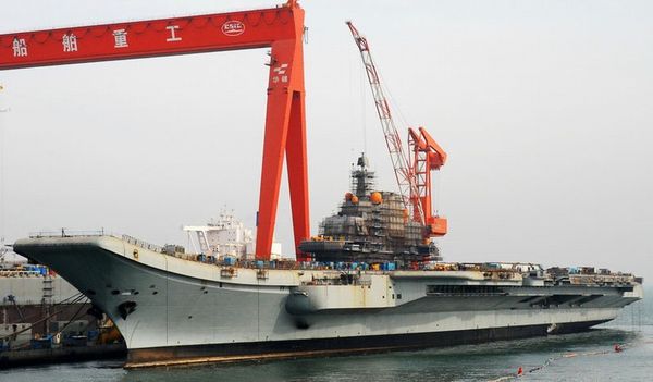 資料圖:在大連進(jìn)行改裝的瓦良格號(hào)航母。