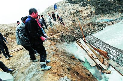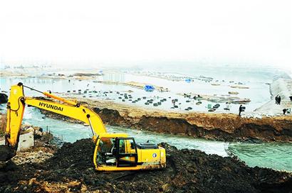 ????“讓挖掘機(jī)把附近企業(yè)的圍墻推倒,利用石塊將污水口堵住?!彪S著現(xiàn)場(chǎng)指揮人員發(fā)令,一輛挖掘機(jī)將工地附近的圍墻推倒,其他兩輛挖掘機(jī)將石塊投入污水口。昨日上午10時(shí)許,經(jīng)過(guò)緊張的部署和搶險(xiǎn),倒灌的排污口終于被成功堵住。