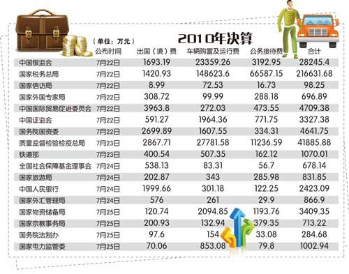 教育部、中科院、中國社科院、國家自然科學(xué)基金委、國家行政學(xué)院、國家中醫(yī)藥管理局、國家新聞出版總署、新華通訊社、中華全國供銷合作總社、中國外文出版發(fā)行事業(yè)局、國家檔案局等11家部門選擇在了7月的第二個周五公布;緊接著,國家知識產(chǎn)權(quán)局、國家發(fā)改委、交通運輸部、農(nóng)業(yè)部、監(jiān)察部、衛(wèi)生部等6個部門在第三個周五曬出賬本;上周五,又有中國銀監(jiān)會、國家稅務(wù)總局、國家信訪局、國家外國專家局、中國國際貿(mào)易促進(jìn)委員會、中國證券監(jiān)督管理委、國務(wù)院國資委等7家部委集中公布。