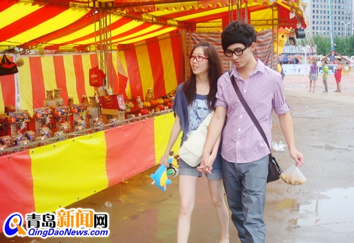 ????雨中,一對(duì)對(duì)情侶相互依偎在傘下行走,頗有雨中漫步的浪漫氣息,形成啤酒城內(nèi)一道道獨(dú)特的風(fēng)景。來(lái)自韓國(guó)的吳承澤和他的女朋友首次來(lái)到啤酒節(jié),恰巧觀賞到雨中啤酒城的清新爽快,直呼“太好了”。