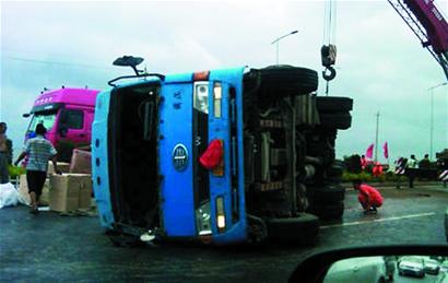 ????凌晨3時,滿載洗衣粉等生活用品的拖掛車在環(huán)灣大道上急速行駛,眼看就要到達目的地,沒想到拖掛車突然失控,車頭沖上了馬路中間的隔離帶,碾過30多米的綠色植被后,拖掛車沖上逆行車道側翻倒地,車上貨物灑漏,將環(huán)灣大道南向北的4條車道占了3條。從昨天清晨6時30分開始,直到上午9時30分左右,環(huán)灣大道從八號碼頭上橋口直到跨海大橋收費站南側500米處,約5公里路段出現大堵車,至少千輛汽車被堵在路上,一些急著趕飛機的乘客被迫一路向北健步行。 事件 拖掛車側翻堵了三車道 “我剛才開車送客人經過環(huán)灣大道,看見一輛18.5米長的拖掛車在南向北車道上側翻倒地,已經有民警趕到現場,但看樣子一時半會兒沒法將車移開,恐怕待會會導致堵車?!弊蛱烨宄?時左右,出租車司機王先生告訴記者,在環(huán)灣大道距離跨海大橋收費站還有大概500米處,南向北的4條車道中有3條車道已經被側翻的拖掛車和灑漏的貨物堵得死死的,他經過時路上車流還很少,但大家已經要減速排隊通過,等再過1個小時,路上的車多起來時,很可能就會引起大堵車。記者聞訊后立即聯系了122報警,工作人員表示,交警和道路清障人員已經趕到現場,正在設法將拖掛車挪走。