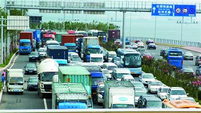 ????“照現在這個堵車法,咱們恐怕再過1個小時都趕不過去,我看不如咱們在瑞昌路出口出去,繞到滄口四流中支路,從北向南車道繞過去?!庇浾叱俗鲎廛噺陌颂柎a頭附近入口駛上環(huán)灣大道,但出租車只開了幾分鐘就被前面的車流堵住,無論出租車司機怎么頻繁變換車道,出租車的車速都沒能超過每小時30公里,到最后前面堵的車越來越多,出租車只能幾米幾米地向前挪動。來到瑞昌路出口處時,出租車司機一臉無奈跟記者商量,他寧可不要已經跑的30多元車費,也不愿意跟隨車流繼續(xù)向北挪動。記者看到有很多車輛已經變換車道,從瑞昌路出口處離開,但仍然有很多車輛已經無法改道,只能繼續(xù)被堵在路上。出租車司機告訴記者,從八號碼頭入口處直到記者要去的跨海大橋收費站位置,大概要經過5公里的堵車地帶。