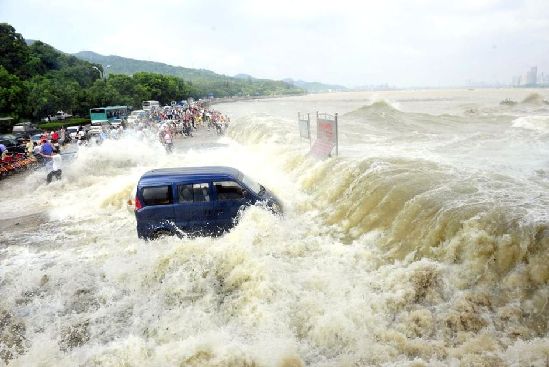 2011年8月31日,農(nóng)歷八月初三,下午15:15左右,在錢塘江杭州段最上游的傳統(tǒng)觀潮點(diǎn)——九溪水廠觀潮點(diǎn)附近,預(yù)測(cè)中的大潮訊如期而至,洶涌的潮水翻過(guò)江堤護(hù)欄激起7、8米的浪頭,將數(shù)十名觀潮者沖倒在地,多人受傷,十余輛停在堤岸上的汽車被沖移。觀潮者在漫過(guò)江堤的潮水中四處逃竄。