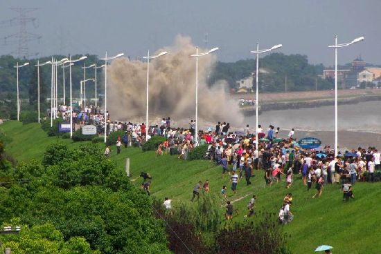 2011年8月31日,農(nóng)歷八月初三,下午15:15左右,在錢塘江杭州段最上游的傳統(tǒng)觀潮點——九溪水廠觀潮點附近,預(yù)測中的大潮訊如期而至,洶涌的潮水翻過江堤護欄激起7、8米的浪頭,將數(shù)十名觀潮者沖倒在地,多人受傷,十余輛停在堤岸上的汽車被沖移。據(jù)悉,當日潮水受臺風(fēng)“南瑪都”外圍影響,潮借風(fēng)勢,創(chuàng)造了近十年來的最高值。