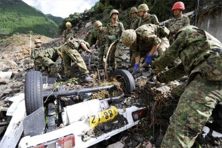 日本自衛(wèi)隊(duì)員將埋在泥沙中的車輛挖出以尋找失蹤人員。6日上午9時(shí)08分?jǐn)z于奈良縣五條市大塔町宇井地區(qū)。(共同社)