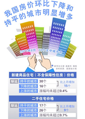 從單月的走勢看,70個大中城市中,8月份新建商品房價高于7月的有24個,另有46個城市環(huán)比下跌或持平。