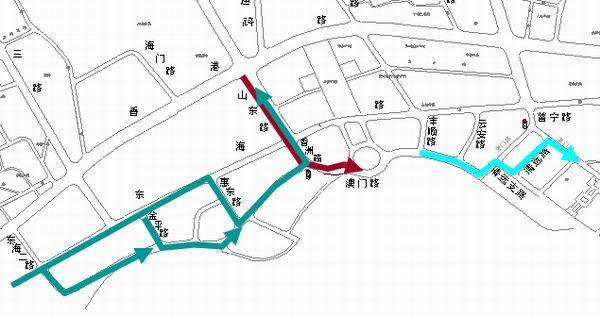 東海路山東路路口禁止自西向北的左轉(zhuǎn)原自西向北左轉(zhuǎn)的車輛經(jīng)東海路—惠東路(或金平路)—澳門路—香洲路—山東路實(shí)現(xiàn)左轉(zhuǎn)。