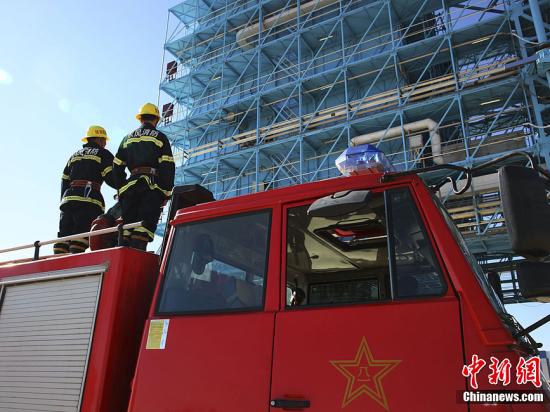 9月28日13時,天宮一號目標(biāo)飛行器、長征二F運(yùn)載火箭組合體開始加注。圖為消防應(yīng)急人員在發(fā)射平臺值班。中新社發(fā) 秦憲安攝