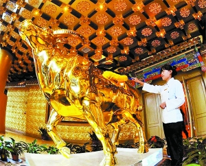 在江蘇華西村龍希國際大酒店60層,工作人員正在為“鎮(zhèn)樓之寶”號稱“價(jià)值3億元人民幣”的金牛做保潔。據(jù)華西村老書記吳仁寶介紹,這頭一噸重的金牛從入庫到現(xiàn)在已增值三成。龍希國際大酒店大樓共74層,與北京國貿(mào)三期高度一樣,已成為華西村新的地標(biāo)性建筑。