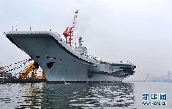 資料圖:8月10日,中國航母平臺進(jìn)行出海航行試驗。按照試驗計劃,首次出海試驗時間不會太長,返回后將繼續(xù)在船廠進(jìn)行改裝和測試工作。圖為拍攝于大連的中國航母平臺。新華社發(fā)