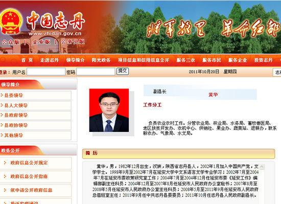 志丹縣人民政府公眾信息網(wǎng)“領(lǐng)導(dǎo)介紹”欄目的黃華簡(jiǎn)歷