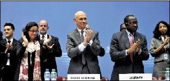 世貿(mào)組織總干事拉米(中)和與會(huì)人員起立鼓掌慶祝俄羅斯加入世貿(mào)組織。