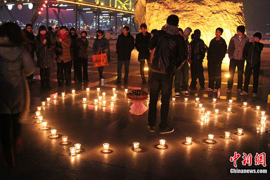 12月24日是西方傳統(tǒng)節(jié)日平安夜,在蘭州黃河岸邊,寒風刺骨,一男青年在朋友的幫助下向女友浪漫求婚,引得路人駐足圍觀。張道正 攝