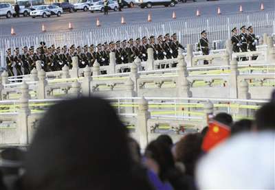 昨日7時(shí)30分許,國旗護(hù)衛(wèi)隊(duì)在軍樂隊(duì)的伴奏下,整齊地邁步走向廣場(chǎng)旗桿。(記者 王貴彬 攝)