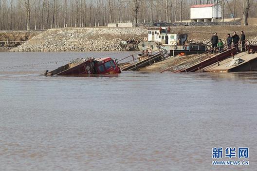 1月3日4時左右,兩輛滿載石料的貨車通行濟南東郊黃河浮橋時,原本行駛在后側(cè)的貨車在橋面上違章超車,兩車并行時浮橋板面不堪重負斷裂,兩車隨浮橋沉入黃河中。兩名司機在車輛下沉?xí)r成功逃生。目前,相關(guān)部門正采取措施加緊對貨車實施救援并修復(fù)浮橋。新華社發(fā)(呂傳泉攝)