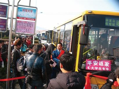 今天全國(guó)鐵路春運(yùn)正式啟動(dòng),隨著島城各大高校學(xué)生陸續(xù)放假,紛紛踏上回家的旅程,昨天青島火車(chē)站出現(xiàn)春運(yùn)首個(gè)學(xué)生流高峰。由于隧道1路線途經(jīng)山科大、濱海學(xué)院、理工大學(xué)等4所高校,學(xué)生放假返鄉(xiāng)集中在7日到10日,預(yù)計(jì)節(jié)前返鄉(xiāng)人數(shù)在6-8萬(wàn)人次。公交海底隧道路隊(duì)從昨天起開(kāi)通 “平安返家學(xué)生專車(chē)”,隧道公交“專車(chē)”將學(xué)生一站送到火車(chē)站。據(jù)悉,昨天一天隧道1路運(yùn)送學(xué)生旅客約1.7萬(wàn)人次。 山科大門(mén)前排隊(duì)200米 昨日清晨5時(shí)40分,公交隧道1路首班車(chē)正點(diǎn)到達(dá)開(kāi)發(fā)區(qū)山東科技大學(xué)門(mén)前,準(zhǔn)備趕早班火車(chē)的大學(xué)生們?cè)缫烟嶂欣畹群蛟谲?chē)站,在路隊(duì)工作人員的指揮下,學(xué)生們有序地排隊(duì)上車(chē)。 上午9時(shí),記者在隧道1路始發(fā)站前看到,等待乘車(chē)的學(xué)生排起了長(zhǎng)長(zhǎng)的隊(duì)伍,一眼望不到頭,記者粗略估算了一下,隊(duì)伍足有200米長(zhǎng)。隧道1路流水發(fā)車(chē),一輛車(chē)滿了后立即發(fā)走,隨后另一輛跟上,長(zhǎng)龍似的隊(duì)伍在快速移動(dòng)著,不過(guò)由于乘車(chē)的學(xué)生不斷加入,長(zhǎng)隊(duì)看上去似乎沒(méi)有縮短多少,但是秩序井然有序?!拔沂窍挛?點(diǎn)的火車(chē),為了不耽誤乘車(chē),還是早出發(fā)保險(xiǎn)啊。”山科大大二學(xué)生小劉告訴記者,昨天各個(gè)學(xué)院都放假了,大家都迫不及待地想回家,他考慮到坐車(chē)的人肯定很多,所以就提前離校,寧愿早到火車(chē)站候車(chē)也別誤了火車(chē)。 加開(kāi)專車(chē)送學(xué)生趕火車(chē) 記者在現(xiàn)場(chǎng)注意到,隧道2路車(chē)趕來(lái)支援,幫助隧道1路運(yùn)送學(xué)生。“隧道2路是我們?yōu)榱朔掂l(xiāng)的學(xué)生特別開(kāi)通的‘平安返家學(xué)生專車(chē)’,從山科大直接送到火車(chē)站?!惫缓5姿淼缆逢?duì)書(shū)記董雪華介紹說(shuō),隧道1路線途經(jīng)山科大、濱海學(xué)院、理工大學(xué)等4所高校,他們提前了解到7日到10日是這幾所高校的學(xué)生放假返鄉(xiāng)的集中時(shí)段,之前摸底了解到這4所高校返鄉(xiāng)人數(shù)達(dá)6萬(wàn)到8萬(wàn)人次,所以提前做出了安排和部署。 記者了解到,隧道1路原有全程車(chē)班次加密,增加早班車(chē)班次安排,執(zhí)行“雙車(chē)計(jì)劃”,早上1至5班執(zhí)行兩車(chē)同發(fā),保證早上不滯留返鄉(xiāng)學(xué)生,同時(shí)滿足非學(xué)生乘客的正常乘車(chē)。同時(shí)增加了區(qū)間車(chē),從山科大始發(fā)站點(diǎn)到火車(chē)站,沿途站點(diǎn)全部???,保證沿途高校的大學(xué)生乘車(chē)需求。另外隧道路隊(duì)還特別開(kāi)通了“平安返家學(xué)生專車(chē)”,從隧道2路調(diào)集車(chē)輛和人員來(lái)支援,從山科大始發(fā)直達(dá)火車(chē)站,中間不停靠。 為了讓學(xué)生盡快乘車(chē),隧道2路線劉艷、蘭柏、李啟榮、曲振奎等16名駕駛員和后勤人員主動(dòng)擔(dān)當(dāng)志愿者,跑完夜班車(chē)又一早趕來(lái)科技大學(xué)幫忙,充當(dāng)起了“搬運(yùn)工”,幫著學(xué)生拿行李。 一天運(yùn)送學(xué)生1.7萬(wàn)人次 記者隨后登上一輛學(xué)生專車(chē),由于學(xué)生攜帶行李比較多,整個(gè)車(chē)廂里滿滿當(dāng)當(dāng)?shù)?,專?chē)中間不靠站,平時(shí)全程要65分鐘,而專車(chē)到達(dá)火車(chē)站只用了不到40分鐘?!皩W(xué)生專車(chē)真是方便了我們學(xué)生,往年我們光坐車(chē)到輪渡就得40分鐘。”山科大大四學(xué)生田銘下了車(chē)后開(kāi)心地說(shuō),他要乘坐下午3點(diǎn)的火車(chē)回河南老家,本以為路上得花費(fèi)不少時(shí)間,沒(méi)想到12點(diǎn)就到火車(chē)站了。 據(jù)統(tǒng)計(jì),昨天隧道1路加上來(lái)支援的隧道2路學(xué)生專車(chē),一共發(fā)送了239個(gè)班次,運(yùn)送乘客約2.1萬(wàn)人次,而學(xué)生就占了8成多,約為1.7萬(wàn)人次。據(jù)悉,7日到10日,隧道路隊(duì)將持續(xù)開(kāi)通學(xué)生專車(chē),保證幾所高校的學(xué)生順利趕上火車(chē)。 昨迎春運(yùn)學(xué)生流首高峰 昨日,青島火車(chē)站迎來(lái)了節(jié)前學(xué)生流的首個(gè)高峰,記者在青島火車(chē)站采訪時(shí)了解到,隨著島城各大高校陸續(xù)放假,學(xué)生返鄉(xiāng)流開(kāi)始劇增,據(jù)悉,1月7日-1月15日將迎來(lái)學(xué)生流和部分農(nóng)民工流高峰,整個(gè)春運(yùn)期間,青島站預(yù)計(jì)發(fā)送學(xué)生客流18萬(wàn)人次,而節(jié)前就有10萬(wàn)人次,節(jié)后8萬(wàn)人次。 春運(yùn)故事 大學(xué)生車(chē)票過(guò)期列車(chē)長(zhǎng)墊補(bǔ)票錢(qián) 好不容易買(mǎi)到回家的火車(chē)票,臨上車(chē)了卻發(fā)現(xiàn)車(chē)票竟然過(guò)期了,回不了家可怎么辦?這是來(lái)自濰坊的大四學(xué)生劉冰近日遇到的難題,在福建閩江學(xué)院服裝設(shè)計(jì)系上學(xué)的他,和3個(gè)同學(xué)1月4日準(zhǔn)備搭乘K68次福州開(kāi)往青島的列車(chē)回家,費(fèi)了好大的勁買(mǎi)到票,可是當(dāng)他們?cè)?號(hào)車(chē)廂驗(yàn)票上車(chē)時(shí)卻被卡住了,列車(chē)員說(s