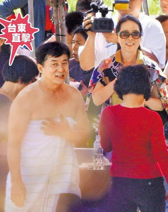 成龍(左)拍完落水戲裹著浴巾,林鳳嬌(戴墨鏡者)在旁笑得燦爛。(圖片來源:中新網(wǎng)) 中新網(wǎng)1月9日電 據(jù)臺(tái)灣媒體報(bào)道,57歲影壇大哥成龍?jiān)鴣砼_(tái)灣拍《重案組》獲金馬影帝,日前其20年后新片《十二生肖》再度來臺(tái)取景,這是他的101部電影,號(hào)稱是最后1部動(dòng)作片。擔(dān)任“成龍影業(yè)”董事兼秘書的“龍嫂”林鳳嬌,也難得露面愛相隨。昨成龍拍落水戲,用浴巾圍著胸肌御寒,林鳳嬌則戴墨鏡在旁視察片場(chǎng),陪老公共進(jìn)午餐。 昨早6時(shí)許,10多臺(tái)劇組車輛前往拍攝地點(diǎn)河?xùn)|鄉(xiāng)金樽漁港,身兼導(dǎo)演與男主角的成龍,則是到早上7點(diǎn)多才下樓用早餐,明明是在室內(nèi),他仍戴著墨鏡遮星光。拍片現(xiàn)場(chǎng)是在一片懸崖邊的叢林,工作人員在離片場(chǎng)300公尺處架起封鎖線,不讓生人靠近。稍晚,男主角之一的韓星權(quán)相佑和兩位長(zhǎng)發(fā)美女穿著沖浪裝現(xiàn)身。 “龍嫂”林鳳嬌則直到11點(diǎn)多才出現(xiàn),她與同行的中年女性在片場(chǎng)有說有笑;28年前她嫁給成龍后淡出演藝圈相夫教子,堅(jiān)強(qiáng)面對(duì)吳綺莉私生女風(fēng)波,接手“成龍影業(yè)”出任JC Group公司董事兼秘書。 傳成龍身家超過90億元臺(tái)幣,家中財(cái)務(wù)也由林鳳嬌一手打點(diǎn),多年來她甘愿當(dāng)大哥身后的女人很少曝光,去年曾被拍到低調(diào)返臺(tái)會(huì)親友,幫兒子房祖名挑劇本,足見“龍嫂”地位穩(wěn)固。 中午用餐時(shí)間,劇組陸續(xù)往草地上的帳棚移動(dòng)準(zhǔn)備放飯,成龍最晚現(xiàn)身,剛拍完落水戲的他赤裸著上身只圍著1條浴巾,不時(shí)用手拉位于胸前的浴巾,他和林鳳嬌相對(duì)而坐,夫妻倆就在美麗的海岸線旁吹著海風(fēng)共進(jìn)浪漫午餐。 |