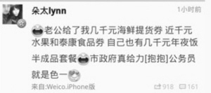 昨日,微博上最火的,是一位自稱上海某公務(wù)員的嬌妻網(wǎng)友“朵太lynn”。“朵太lynn”一詞以近17萬的搜索量,霸占著微博昨日“熱搜榜”第一位,起因是她在微博寫道:“老公給了我?guī)浊гur提貨券,近千元水果和泰康食品券,自己也有幾千元年夜飯半成品套餐,市政府真給力,公務(wù)員就是色……”(編者注:疑為‘公務(wù)員就是好’)原微博一發(fā)出,一小時內(nèi)就有1000多次轉(zhuǎn)發(fā),“朵太lynn”迅速有了火爆網(wǎng)絡(luò)的名字“提貨姐”。有網(wǎng)友留言:“姑娘,你要害死你老公啊!”還有網(wǎng)友調(diào)侃:“不怕神一樣的反貪,就怕豬一樣的老婆……”