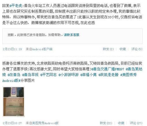 ????蘧先生一氣之下把這件事的前因后果寫下來(lái)發(fā)了微博,并打了投訴電話。微博發(fā)出后,很多網(wǎng)友都對(duì)此情況表示關(guān)注。21日,青島火車站的工作人員電話聯(lián)系到蘧先生,并按票價(jià)把錢退給了他。工作人員告訴他,蘧先生這事是特事特辦,至于在實(shí)名制的前提下丟了票,到底該怎么辦,鐵路系統(tǒng)還未有統(tǒng)一的制度規(guī)定。