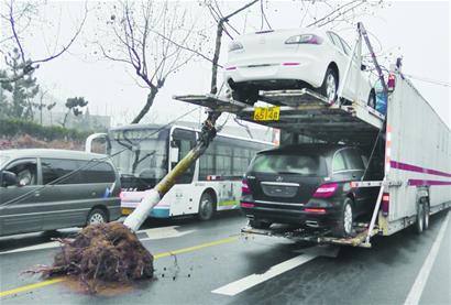????今晨6時(shí)30分許,一輛運(yùn)送小汽車的雙層大貨行至56中門口時(shí)準(zhǔn)備拐彎,突出的車尾直接將路旁一棵4米多高的樹刮倒并連根拔起。貨車拖著大樹駛出40多米后,在一輛轎車的提示下才停下車。 ????今晨7時(shí)許,接到市民的報(bào)料電話后記者迅速趕到現(xiàn)場,一輛近20米長的白色雙層大貨車停在南昌路上,車廂里裝著至少八輛馬自達(dá)、奔馳等車輛。記者來到56中門前看見,一個(gè)長寬約1.5米的大坑橫在路邊,旁邊幾棵樹的樹枝也被刮了一地。 ????在現(xiàn)場的另一位目擊者張先生告訴記者,就在這輛大貨車刮倒了大樹還在拐彎時(shí),身后駛來了幾輛小轎車。這些車在超車時(shí),都減了減速亮了一下車尾的紅燈,似乎在示意大貨車出了問題。 “我拐彎以后聽見身后傳來了‘吱吱吱’的聲音,一看反光鏡,車后拖著一棵樹在走,我馬上踩下了剎車。 ”司機(jī)告訴記者,他這明白為何那些過路的車輛都要在超車減速亮一下紅燈,就是要提醒他車后出事了。 ????“我提前打了方向盤拐彎,不知道怎么著后面就把樹給刮住了。 ”據(jù)司機(jī)介紹,這些車是從上海運(yùn)來準(zhǔn)備送往青島的4S店里。事發(fā)后車廂里裝的車都沒有什么損失。 (記者 劉卓毅) |