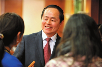 全國(guó)人大代表鐵道部官員武汛答記者問。本報(bào)記者張斌攝