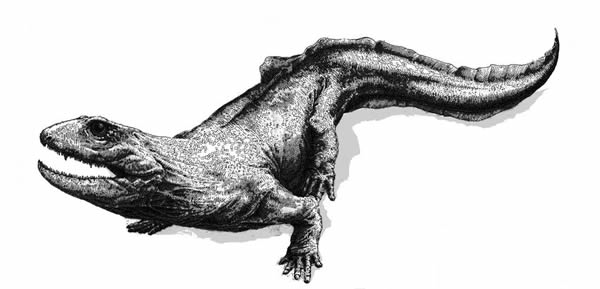 化石群中一類兩棲動(dòng)物的復(fù)原圖(芝加哥大學(xué)及蘇格蘭博物館的Michael Coates繪) 來(lái)自劍橋大學(xué)動(dòng)物學(xué)博物館的Jennifer Clack和古生物學(xué)家Stanley P. Wood領(lǐng)導(dǎo)的研究團(tuán)隊(duì),在蘇格蘭發(fā)現(xiàn)了一個(gè)新的化石群,它們生存于3.45~3.6億年前之間的1500萬(wàn)年內(nèi),這一時(shí)期曾一度被認(rèn)為生命極度貧乏,僅有海洋生物生存。由于化石發(fā)現(xiàn)極少(僅有一副骨架及其他零星骨骼化石被發(fā)現(xiàn)),古生物學(xué)家一直認(rèn)為在3.59億年前的一次大滅絕事件之后的一段時(shí)間內(nèi)生命貧乏。為解釋這一現(xiàn)象,有學(xué)者猜測(cè)這一時(shí)期大氣含氧量極低,以致無(wú)法支撐生命存在。這一新的發(fā)現(xiàn)填補(bǔ)了地史上的空白,推翻了前人的理論,具有重要的意義。 這個(gè)化石群發(fā)現(xiàn)于蘇格蘭邊境地區(qū)(Scottish Borders,位于愛(ài)丁堡東部的政府直轄區(qū)),由上百件植物及動(dòng)物化石組成,其中一些動(dòng)物化石發(fā)育有腳趾,這也改寫(xiě)了腳趾的出現(xiàn)歷史。美國(guó)古生物學(xué)家Alfred Sherwood Romer曾提出“柔默空缺”(Romer's Gap),即指化石記錄存在的這段空缺,但Wood卻始終相信,造成這一空缺的原因是化石記錄的未發(fā)現(xiàn),而不是進(jìn)化史上這一時(shí)期本身就沒(méi)有生命存在。正是這一信念支撐著他在二十年內(nèi)不斷發(fā)掘,最終,這一化石群的發(fā)現(xiàn)使他的付出獲得了回報(bào)。BBC正打算拍攝與這一發(fā)現(xiàn)相關(guān)的專輯,而這些化石也將被送往位于愛(ài)丁堡的蘇格蘭自然博物館展出。
