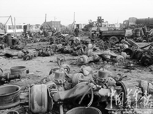 走進(jìn)大門,這家公司規(guī)模之大令記者吃了一驚。公司占地達(dá)上百畝,到處停放著各種報(bào)廢車輛和拆卸下來(lái)的廢舊汽車配件。有很多人和車進(jìn)進(jìn)出出,非常熱鬧。不時(shí)有人開(kāi)著三輪車、小面包車運(yùn)輸各種汽車配件,有的挑幾個(gè)軸承,有的拿幾個(gè)后橋,有的拿輪轂……記者在現(xiàn)場(chǎng)看到,一個(gè)人正在挑汽車后橋,價(jià)錢是每個(gè)1200元。記者問(wèn)“拿這些東西做什么”,回答說(shuō)“回去裝啊”。