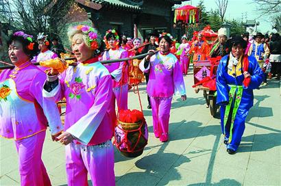 ????隨著一陣鑼鼓聲響起,媒婆抽著煙袋在前引路,4名壯漢抬著花轎,抬喜酒的、推著裝有嫁妝箱小推車的,韓家民俗村來了一支浩浩蕩蕩的迎親隊(duì)伍,這是當(dāng)?shù)貪O民在展示古代迎娶新娘的儀式。