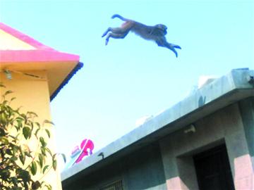 ????村里來(lái)了個(gè)不速之客,讓生性愛(ài)管閑事的家狗來(lái)了勁兒,猴子每到一處總會(huì)引來(lái)一陣“汪汪汪”的狗叫,尤其是一只白色小狗,更是不依不饒,猴子跑到哪,它就跟著叫到哪。吃飽喝足的“孫大圣”終于不耐煩了,在院墻上玩飛檐走壁的絕招時(shí)突然耍了一個(gè)“飛龍?jiān)谔臁?,從墻上一躍而下,小狗還未來(lái)得及轉(zhuǎn)身,就已經(jīng)被這只猴子從身后狠狠地拍了一巴掌。小狗被這一絕招嚇了一跳,夾著尾巴“嗷嗷”叫著逃跑了?!皩O大圣”只是給這只不懂禮貌的小狗一點(diǎn)顏色,接著又是一個(gè)連環(huán)爬,一眨眼的工夫又從地面返回到房頂上。