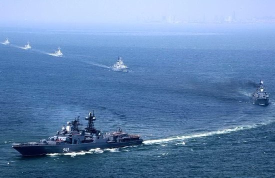 ????隨后,中俄海軍編隊(duì)在青島海面接受兩軍首長(zhǎng)海上檢閱。