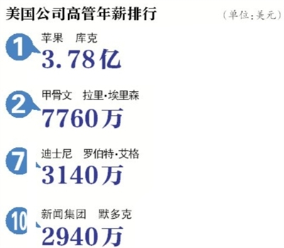 蘋果CEO庫克 據(jù)美國媒體昨日報道,高管薪酬追蹤機構Equilar近日公布了2011年100家上市公司高管的年薪排行榜,蘋果CEO蒂姆·庫克以3.78億美元的年薪高居榜首。 去年庫克的薪酬總收入達3.78億美元,包括工資、額外收入、獎金和一次性股票獎勵。其中股票獎勵所占份額最大,為3.762億美元。這些股票會在未來十年內解禁,一半解禁于2016年,另一半則為2021年。 庫克出任CEO以來,蘋果的經營策略發(fā)生了一系列創(chuàng)新,如派發(fā)股息和更加重視中國市場,促使蘋果股價上漲了近70%。4月6日美股收盤時,蘋果股價報收633.68美元,首次超越谷歌,此時的蘋果市值達5900億美元,位居全球第一,將近谷歌三倍。而當喬布斯從蘋果CEO位置上辭職時,蘋果股價只有373.72美元。單從盈利角度來看,蘋果支付庫克接近4億美元的年收入物有所值。 薪酬排行榜上位居第二的是甲骨文CEO拉里·埃里森,薪酬總額為7760萬美元。排名第三的是美國服飾百貨公司J.C.Penny的CEO羅納德·約翰遜,薪酬總額為5330萬美元。新聞集團CEO默多克排在第十位,年收入為2940萬美元。 鏈接 庫克1年=富士康工人6萬年 庫克的這樣一筆薪酬是個什么概念?《紐約時報》給出了以下一組數(shù)據(jù)或許能很好詮釋。3.78億美元相當于: 迪士尼CEO羅伯特·艾格12年的年薪,他去年年薪是3140萬美元。 花旗集團CEO潘迪特25.4年的年薪(以其去年報酬計算)。 通用電氣CEO伊梅爾特33.5年的年薪(以其去年報酬計算)。 至少相當于蘋果公司在得克薩斯州首府奧斯汀一家新企業(yè)園區(qū)的全部投資。 相當于蘋果公司2011年廣告預算的40%。 富士康一個工人60919年的工資,該公司是蘋果在中國的供應商與代理生產商,員工每天報酬約為17美元。 能買757515臺售價499美元的iPad。 能買1899497部售價為199美元的iPhone 4S手機。(記者 林其玲 實習生 葛文婕) |