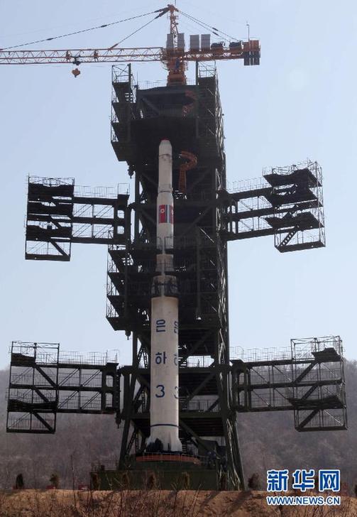 4月13日晨,韓國國防部證實(shí):朝鮮發(fā)射了一枚火箭。這是4月8日在朝鮮平安北道鐵山郡西海衛(wèi)星發(fā)射場拍攝的已經(jīng)基本安裝完成的“銀河3號”運(yùn)載火箭。(新華社記者張利攝)