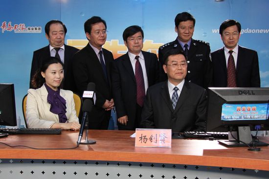 平度市委副書記、市長楊釗賢(一排右一)與網(wǎng)民交流 (陳志偉 攝)