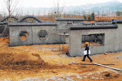 中華園內(nèi),4面高3.9米的墻壁格外引人注目,目前施工已經(jīng)接近尾聲,這些墻透露著濃郁的蘇州園林風(fēng)格。施工人員告訴記者,墻壁自西向東分別叫做點墨墻、瀲滟墻、依綠墻、飛練墻,它們構(gòu)成了一個江南風(fēng)格建筑組合。每面墻壁的窗、門各有特色,四面墻由甬道相連,中間種植銀杏等樹木。