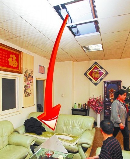 ????據(jù)當(dāng)事人冷先生介紹,中午12時(shí)15分許,他正坐在沙發(fā)上吃飯,同事在旁邊和他聊天?!巴蝗灰宦暰揄懞螅^頂上的天花板就掉了下來,我當(dāng)時(shí)就蒙了。”冷先生告訴記者,因?yàn)楦浇罔F工地施工,經(jīng)常放炮,也就沒當(dāng)回事,但是這一次不一樣,響聲過后,緊接著一塊天花板從頭頂?shù)袈湓谏砼缘纳嘲l(fā)上。“我趕緊側(cè)身躲閃。”冷先生說,但落下來的另一塊天花板還是掉在他的頭上而后落到一側(cè),其右胳膊也被擦傷。