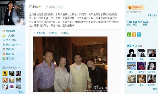 4月25日凌晨,汪小菲發(fā)微博,寫到“上周在我老婆的組織下,十幾年后第一次和爸,媽吃飯。我媽沒完沒了的給我發(fā)微信說:好好珍惜老婆,這么孝順。夫妻不講理,只有老婆對。媽,謝謝您對我老婆這么好,讓我