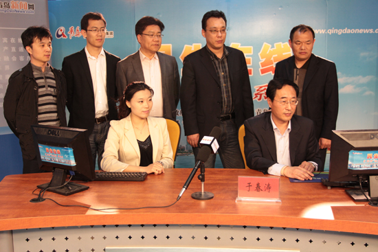 青島市統(tǒng)計局總統(tǒng)計師于春濤(一排右一)與網(wǎng)民在線交流 (周琦 攝)