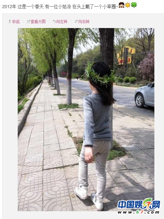 天后王菲在微博中曬小女兒李嫣的背影春光照,王菲配文“2012年 這是一個(gè)春天 有一位小姑涼在頭上戴了一個(gè)小草圈”。從背影看,李嫣身材高挑,完全遺傳了王菲的身形,網(wǎng)友稱李嫣簡(jiǎn)直是縮小版的王菲,長(zhǎng)大了一定能取得像她媽一樣的天后成就。