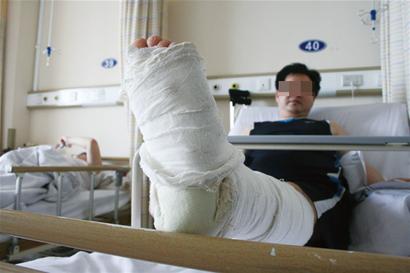 事發(fā)后,駕校工作人員趕緊派人開車將高先生送到海慈醫(yī)院急救,經(jīng)過醫(yī)院診斷,高先生左小腿脛腓骨斷裂,腳踝粉碎性骨折,必須迅速做手術(shù)。“做了兩三次手術(shù),受老罪了。”高先生郁悶地說,尤其讓他生氣的是,當(dāng)時駕駛教練車的竟是一名和他一樣在學(xué)科目二的學(xué)員,教練沒在車上,教練車的油門也沒做處理,結(jié)果那名學(xué)員誤將油門當(dāng)剎車釀成事故。