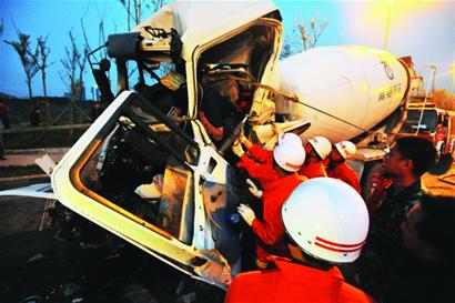 攪拌車(chē)撞上集裝箱擠成鐵餅 司機(jī)當(dāng)場(chǎng)死亡(圖)