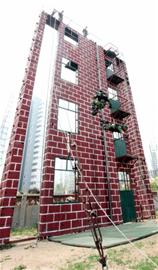 ????記者在攀爬訓練場上看到,隊員們在一個模擬4層居民樓高的攀爬訓練墻上爬上降下,動作非常敏捷?!斑@堵墻共有11米高,我們每天要上下50多次?!标爢T吳杰告訴記者,訓練的科目主要有沿雨水管、繩索爬上,然后飛身跑步下、單環(huán)節(jié)跳下、倒立下等。記者算了一下,他們每天要攀爬600多米高的距離,半個月就等于爬了個 “珠峰”的高度。