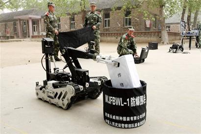 ????排爆機器人最遠可以在100米外通過操控臺操作取走爆炸物。記者在現(xiàn)場看到,一名戰(zhàn)士操作著操控臺,排爆機器人按照指定的方向前進,很快就將爆炸物拿起,放到防爆圍欄內(nèi),兩名戰(zhàn)士迅速上前用防爆毯將防爆圍欄蓋住,危險就基本排除了。“這個機器只能適用平地,在一些條件比較復雜的地方就得用人工排除了?!标爢T演示了穿上防爆服,人工排除爆炸物的過程。一套人工排爆的防爆服等裝備總共重82斤,穿上后只能像機器人一樣慢吞吞行動。