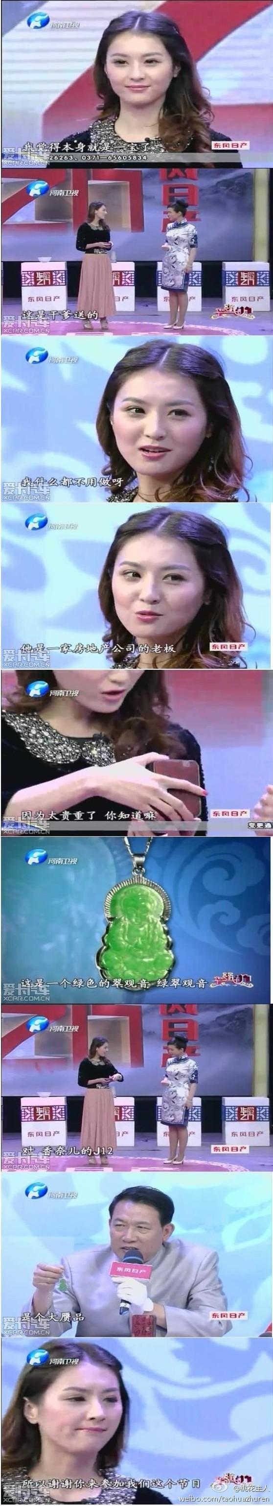 近日,在河南衛(wèi)視《鑒寶》節(jié)目中,一個(gè)美女帶著一個(gè)金鑲玉的翡翠觀音找專家鑒定。主持人問她哪來的,美女說,干爹送的。主持人問,你干爹做什么的?美女說,房地產(chǎn)公司老板。主持人又問,那你做什的?美女說,我什都不做。專家鑒定最后說,所謂金鑲玉翡翠觀音是個(gè)贗品。 該節(jié)目視頻在網(wǎng)上瘋傳,成為一時(shí)笑談。隨后有網(wǎng)友指出,節(jié)目中這位干女兒“是一位平面模特,個(gè)人說明曾經(jīng)是“友情出演,與我無關(guān)” ,現(xiàn)在已改為“…”看來是節(jié)目炒作”。 |