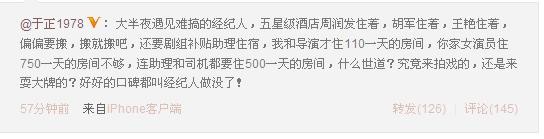 條微博上寫道“大半夜遇見難搞的經(jīng)紀(jì)人,五星級酒店周潤發(fā)住著,胡軍住著,王艷住著,偏偏要搬,搬就搬吧,還要劇組補(bǔ)貼助理住宿,我和導(dǎo)演才住110一天的房間,你家女演員住750一天的房間不夠,連助理和司機(jī)都要住500一天的房間,什么世道?究竟來拍戲的,還是來耍大牌的?好好的口碑都叫經(jīng)紀(jì)人做沒了!”隨后,于正似乎余怒未消,又連發(fā)了兩條微博,稱“自出道以來,合作過的女星無數(shù),范冰冰董潔林心如楊冪陳喬恩霍思燕都隨劇組住宿,從無特殊化,更別說住著五星級還抱怨不能養(yǎng)狗,連助理的待遇也要超過導(dǎo)演,實(shí)在欺人太甚,我知道這一寫,明日必定爭議,無論罵聲也好,換演員也好,我都受了,希望適可而止!”