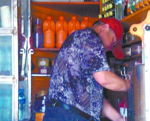 一家小型飲品店,店主在兌飲料,身后貨架上的橙色瓶子內(nèi)就是濃縮液。